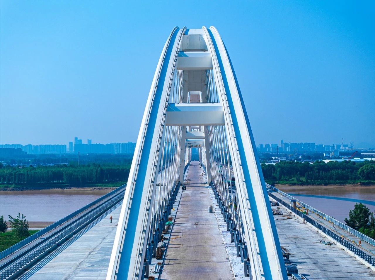 齐鲁黄河大桥主桥为“公轨同层,轨道居中”,双向八车道一级公路标准,主桥钢箱梁宽60.7米,是世界最大跨度、最宽钢箱梁、最高应力幅拉索的下承式组合梁网状系杆拱桥。同时,济南黄河齐鲁大桥跨黄河特大桥将公路、轨道交通、人行道和非机动车道同层共建,实现了桥位资源和土地的集约化利用,减少了对河道和环境的干扰,降低了工程成本。