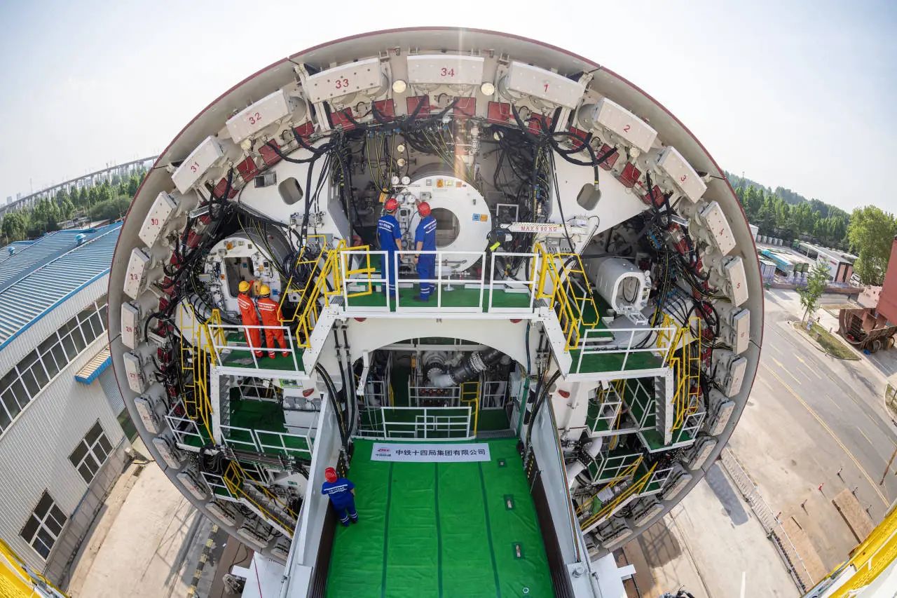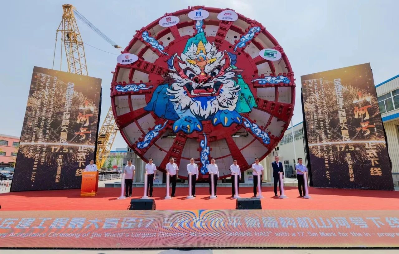 研发制造,最大开挖直径17.5米,盾构机总长163米、重约5200吨、装机总功率12580千瓦;配备各类型开挖刀具共计306把,其中57把具备滚齿互换功能,以优化其在多变地层中的作业性能;装配带压复合型刀盘、伸缩式主驱动、泥水仓伸缩摄像头;搭载刀盘磨损自动监测、设备状态在线监测和“五官一脑”智能化装备系统,并通过大盾构云智慧平台实现远程操控,以保证掘进安全和效率。