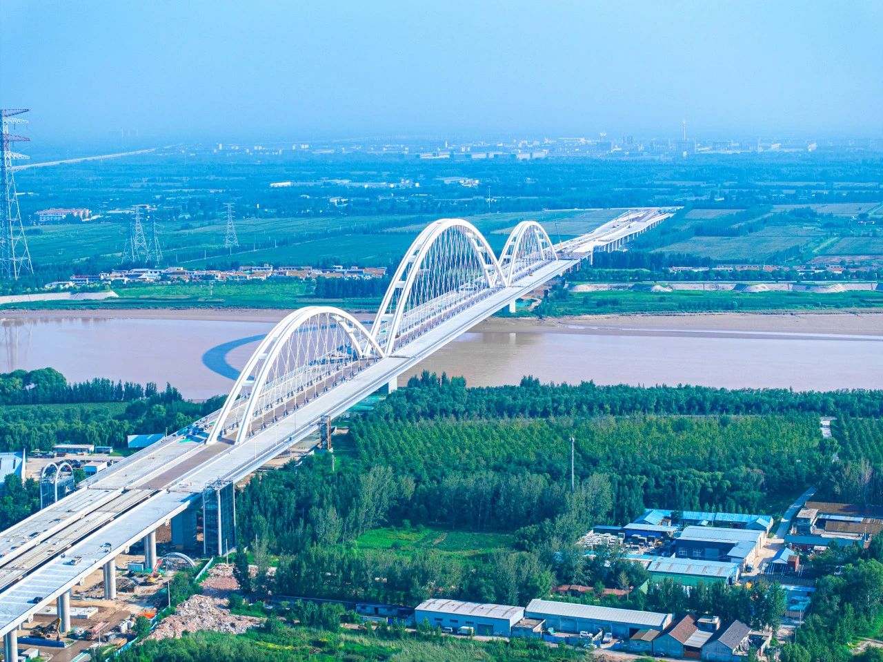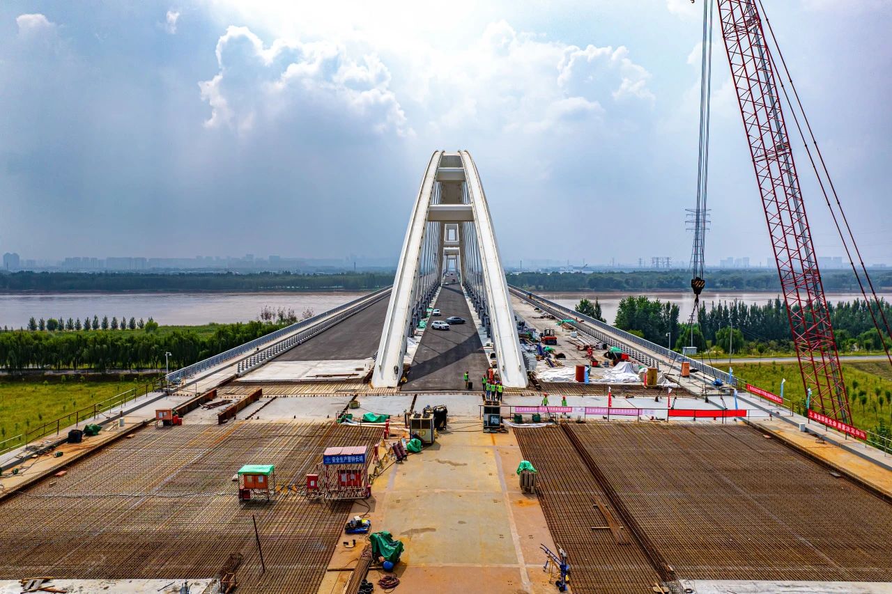 济南黄河齐鲁大桥为黄河之上首座下承式网状系杆拱桥,主跨径达420米、宽60.7m,创世界同类型桥梁最大跨径、最大梁宽,其400Mpa超高应力幅拉索在桥梁建设领域首次研发应用。