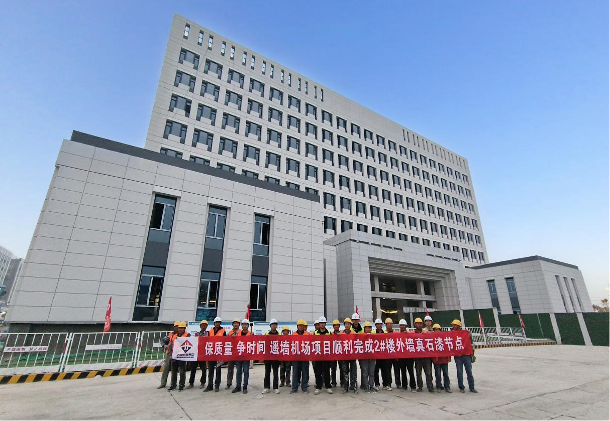 历经50天施工,济南遥墙机场配套设施项目2#边检物业用房外墙真石漆分项工程顺利完工,项目2#边检业务用房含边检办公用房和边检备勤用房,建成后将做为济南遥墙机场边防检查业务的主要办公用房。本项目外墙真石漆面积13280平方,整体以乳白色为主色调,外窗上下辅以灰色及白色点缀,整体设计庄重大气,线条简单分明。