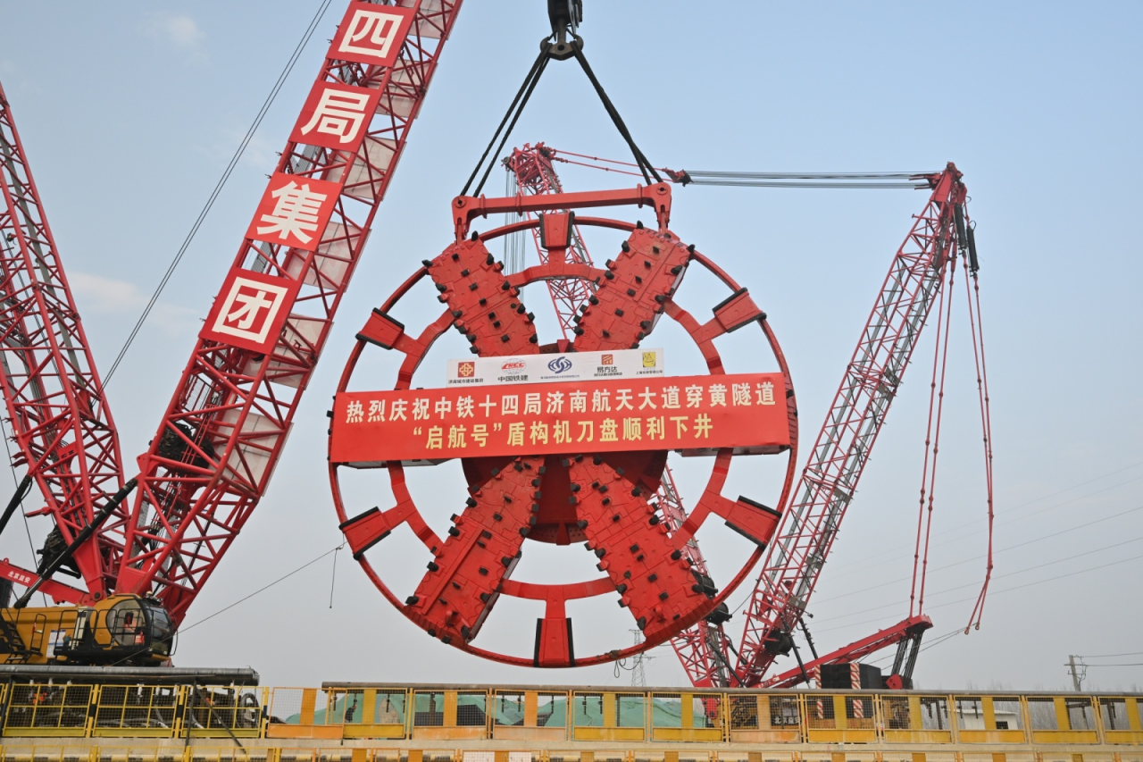 航天大道穿黄隧道“启航号”盾构机整机长约150米,总重量约4495吨。其中盾构机刀盘直径达15.06米,总重约358吨,由一个中心块、六个主刀臂、六个辅刀臂组成。刀盘下井是盾构机整机组装阶段最为重要、难度最大、危险系数最高的一道工序。