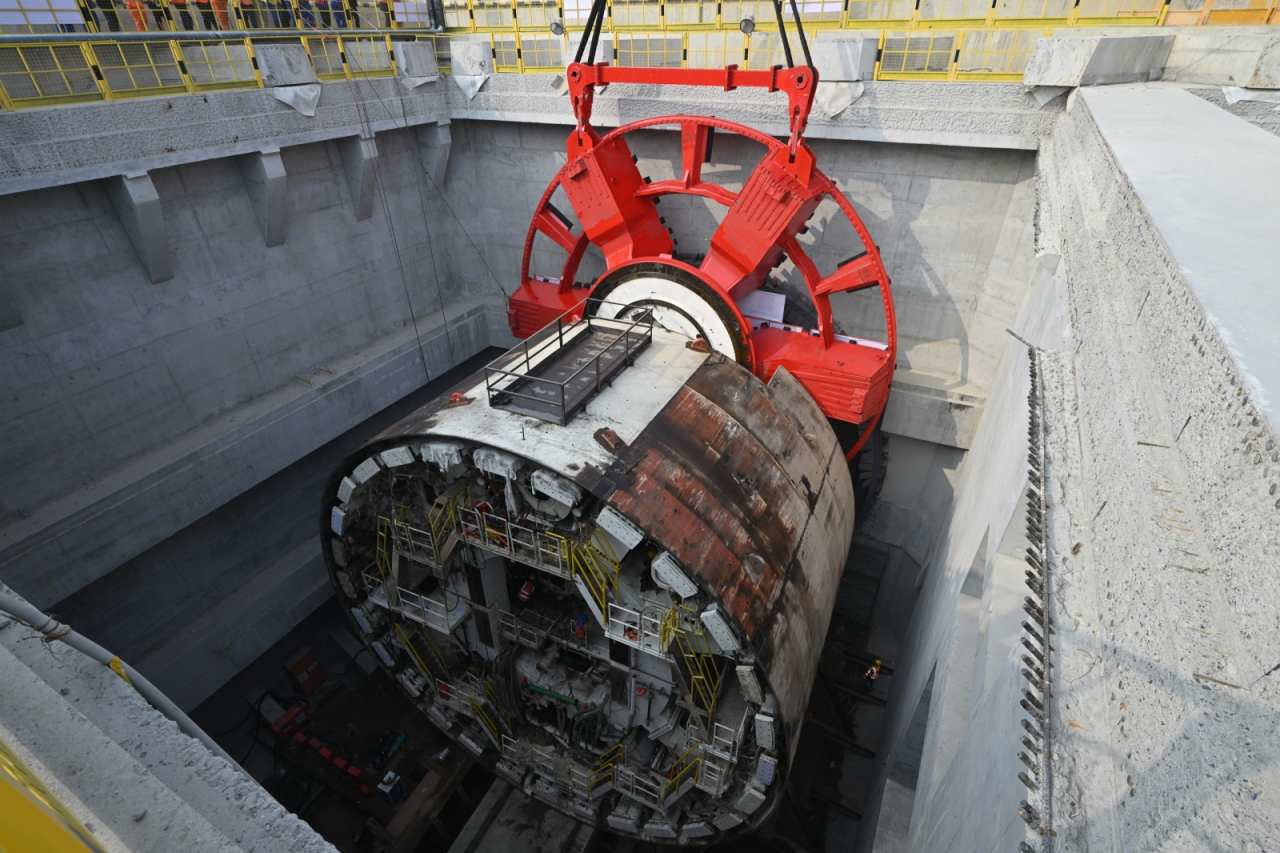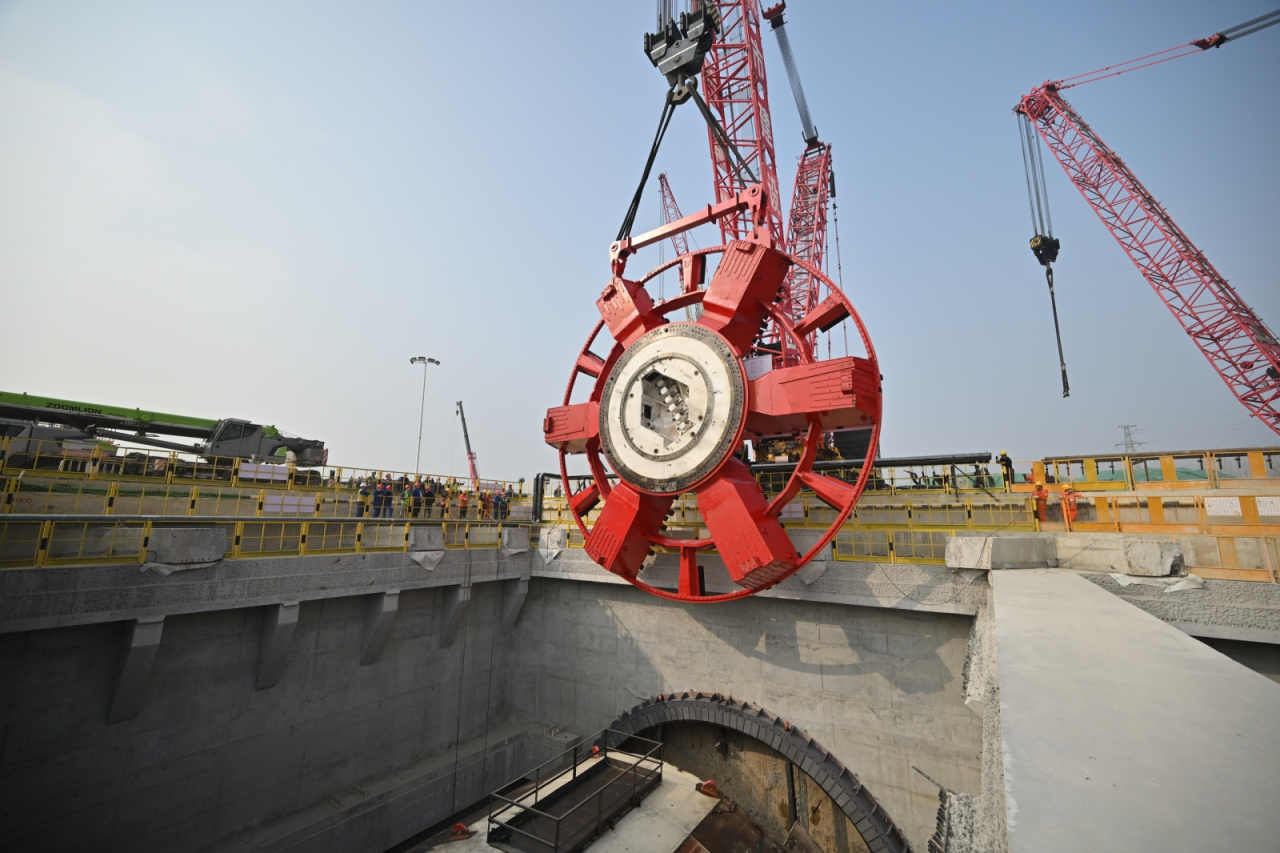 3月1日,直径15.06米的超大直径盾构机“启航号”刀盘在两台履带吊助力下完成“空中转体”后缓缓下井,与盾构机精准“合体”,标志着由pg电子